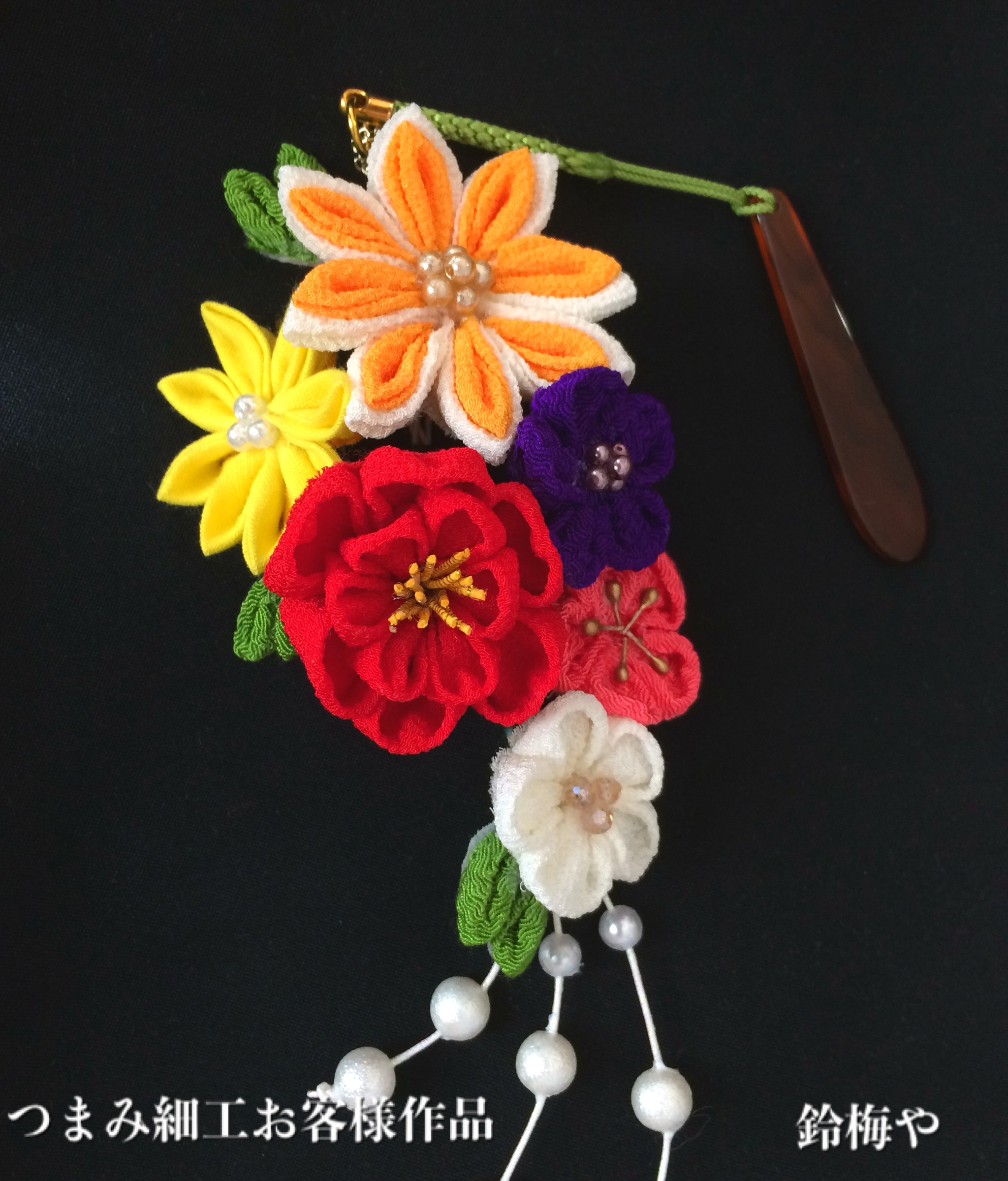つまみ細工で新年の娘さんの成人式のための帯飾りを制作されました。